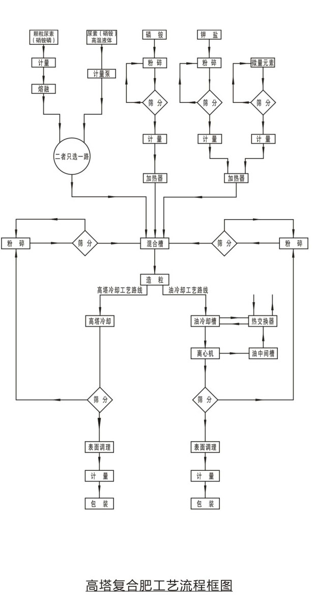 工藝原理固體尿素或硝銨(硝銨磷等)通過熔融器加熱熔融后成為熔融液,也可以直接使用蒸發(fā)濃縮后的液態(tài)尿液(硝銨)液中加入相應(yīng)的磷肥、鉀肥、填料及添加劑制成 混合料漿。混合料漿進入高塔造粒設(shè)備進行噴灑造粒,物料在從高塔下降過程中,與塔底上升氣流阻力相互作用,與其進行熱交換后降落到塔底,落入塔底的物料,經(jīng)篩分表面處理后得到顆粒復(fù)合肥。